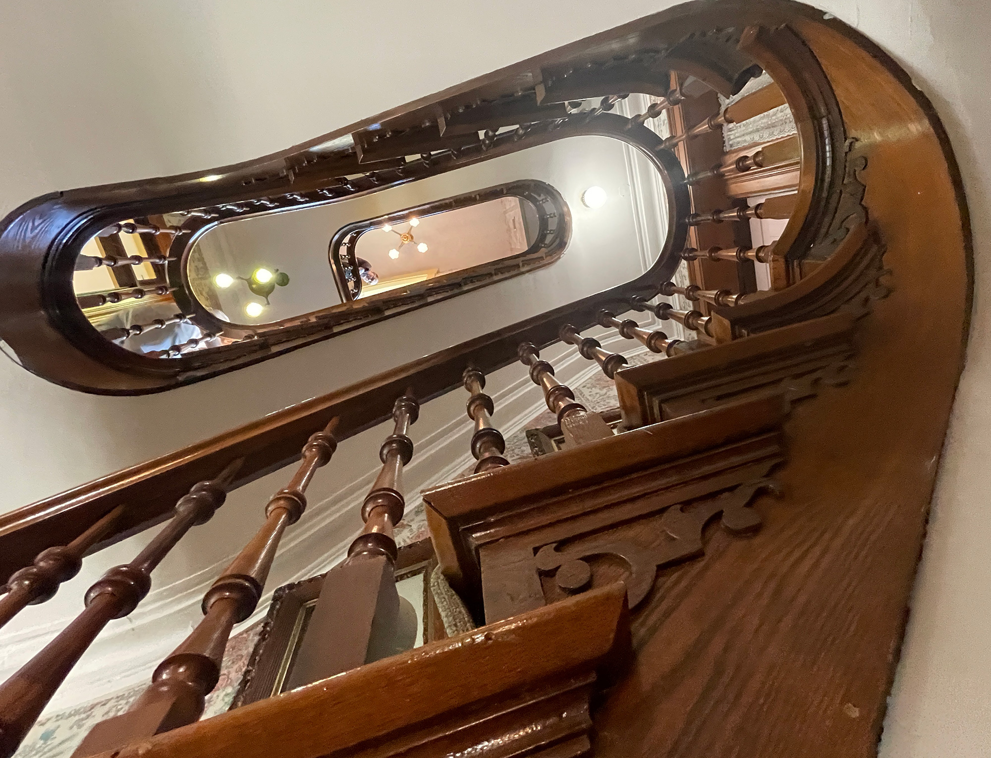 From the outside, The Gruenewald Historic House is French Second Empire, with the Mansard roof and protruding gables typical of that style. When you step inside, you can see it is really two houses in one. The rear portion is the original two-story cabin, built in 1860. The front of the house was added in 1873. Altogether, there are four floors, connected by a beautiful winding staircase with a hand-carved banister.